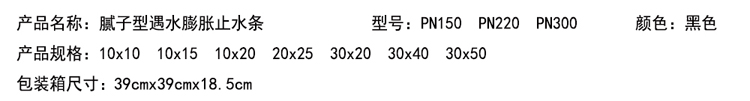 1.膩子型遇水膨脹止水條又稱PN膩子型遇水膨脹橡膠止水條。是以十余種材料經密練、混練、擠制而成的具有遇水膨脹特性的條狀密封材料。