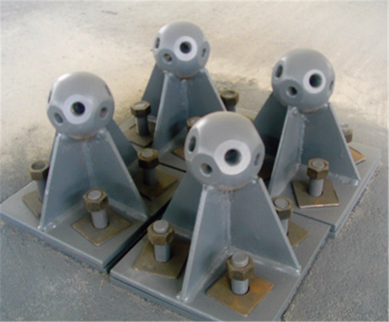 桁架支座由:上支座板、下支座板、球形板、聚四氟乙烯滑板(F4、球面四氟板)及不銹鋼板組成,其中桁架球鉸支座增設了鉸結構,以適應桁架的上拔力要求,桁架抗震減震型球型鋼支座增加了抗震減震結構,以提高桁架建筑的抗震減震,并提高了對剛度的要求。桁架滑動位移支座設置了位移板,并設置限位塊,防止桁架落梁事故,桁架外加肋球型支座增設了肋板,適用于大壓力的桁架建筑。